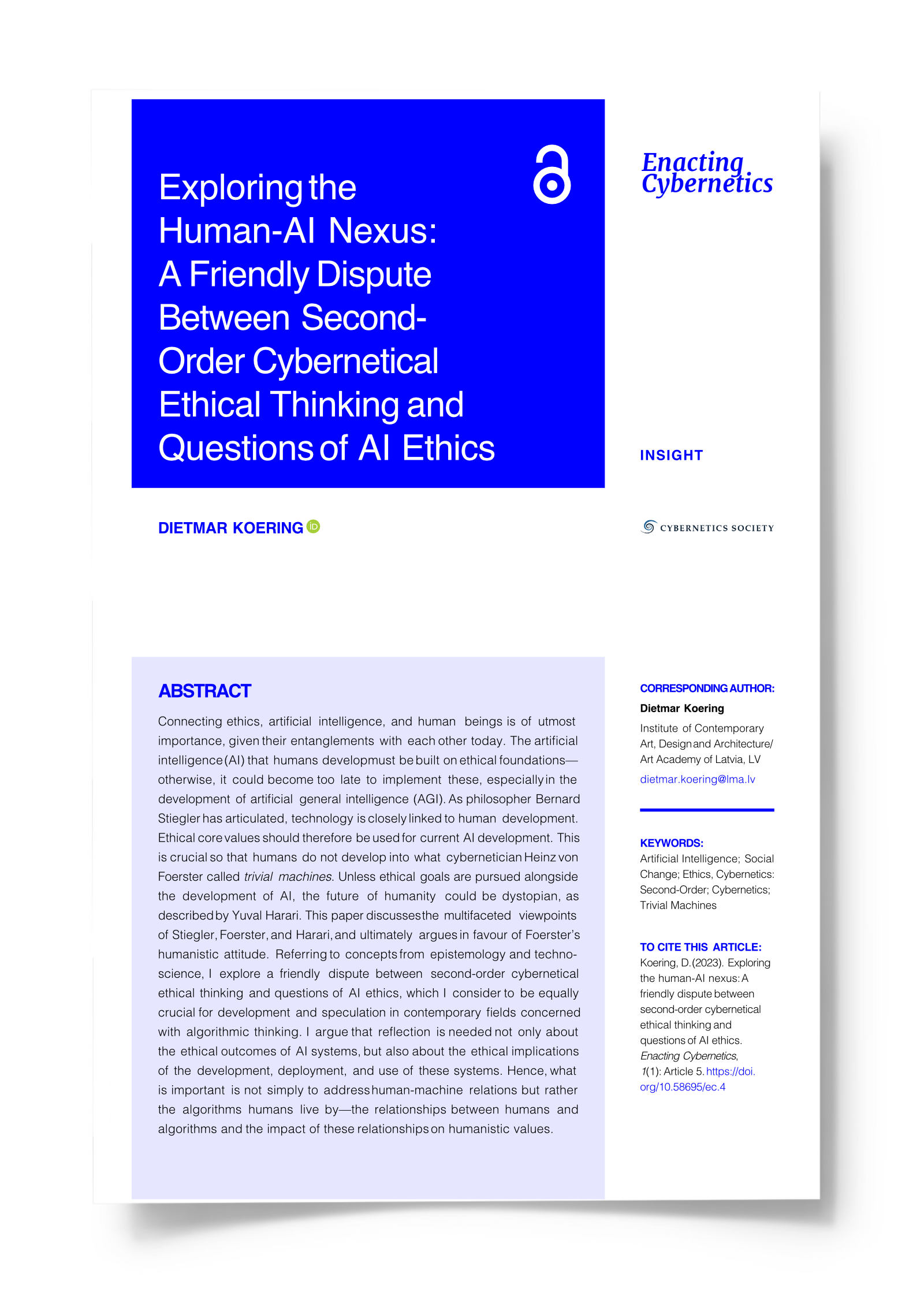 Connecting ethics, artificial intelligence, and human beings is of utmost importance, given their entanglements with each other today. The artificial intelligence (AI) that humans develop must be built on ethical foundations—otherwise, it could become too late to implement these, especially in the development of artificial general intelligence (AGI). As philosopher Bernard Stiegler has articulated, technology is closely linked to human development. Ethical core values should therefore be used for current AI development. This is crucial so that humans do not develop into what cybernetician Heinz von Foerster called trivial machines. Unless ethical goals are pursued alongside the development of AI, the future of humanity could be dystopian, as described by Yuval Harari. This paper discusses the multifaceted viewpoints of Stiegler, Foerster, and Harari, and ultimately argues in favour of Foerster’s humanistic attitude. Referring to concepts from epistemology and techno-science, I explore a friendly dispute between second-order cybernetical ethical thinking and questions of AI ethics, which I consider to be equally crucial for development and speculation in contemporary fields concerned with algorithmic thinking. I argue that reflection is needed not only about the ethical outcomes of AI systems, but also about the ethical implications of the development, deployment, and use of these systems. Hence, what is important is not simply to address human-machine relations but rather the algorithms humans live by—the relationships between humans and algorithms and the impact of these relationships on humanistic values.