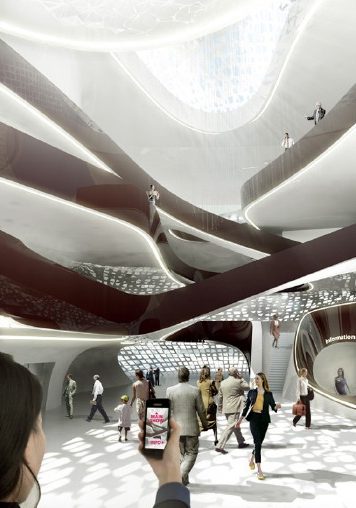 The top floor houses the main show, the gallery spaces and theme islands. Here, an additional lighting through skylights in the ceiling area is provided. The floor plan provides flexible spaces for different types of use. The perforation of the wall creates vistas and offers a fantastic view over the city. The facade of the building consists of a metal skin, which gives the building’s form a homogeneous appearance. The spaces within the wall are filled with glass and solar modules, which feed the household energy system – a link in a regional smart grid system is possible, which is a urban energy storage offering the possibility to deliver and to store on the fly. Therewith the HdZ acts as didactic interface for a futuristic smart grid technology. The spherical shaped bottom side of the building consists of a fully mirrored surface to lead bright daylight into the covered parts of the open ground floor. Exposed to the harsh weather conditions on the river, the metal facade will develoop a fascinating patina over time.